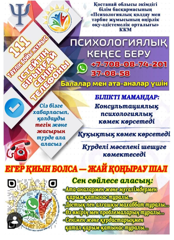 МАҢЫЗДЫ: Аймақтық психологиялық қолдау және тәрбие жұмысы орталығы түсіндіреді: ☎️ 111 – тәулік бойы жұмыс істейтін сенім телефонының нөмірі. Бұл нөмір арқылы отбасына қатысты мәселелер бойынша, балалар мен әйелдердің құқықтарын қорғау, сондай-ақ зорлық-зомбылық пен буллингті қоса алғанда, өмірдегі күрделі жағдайларда тегін кеңес алуға болады!