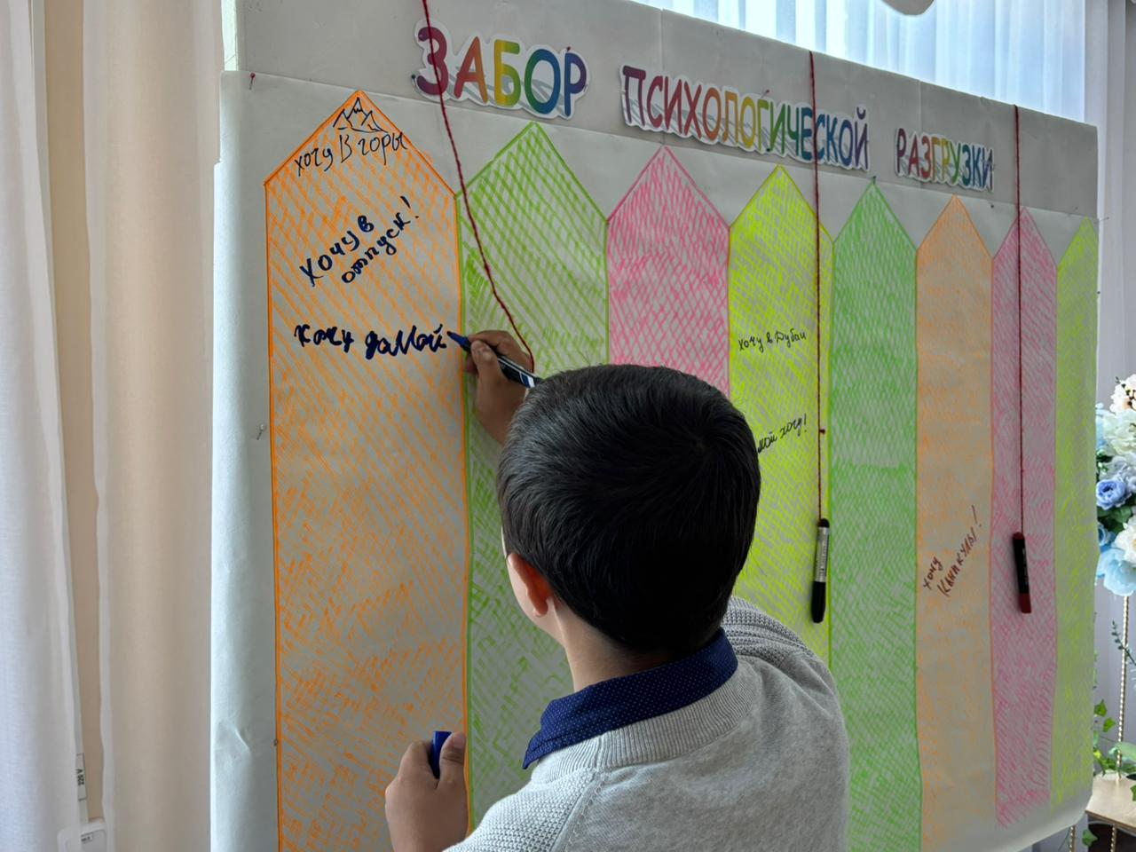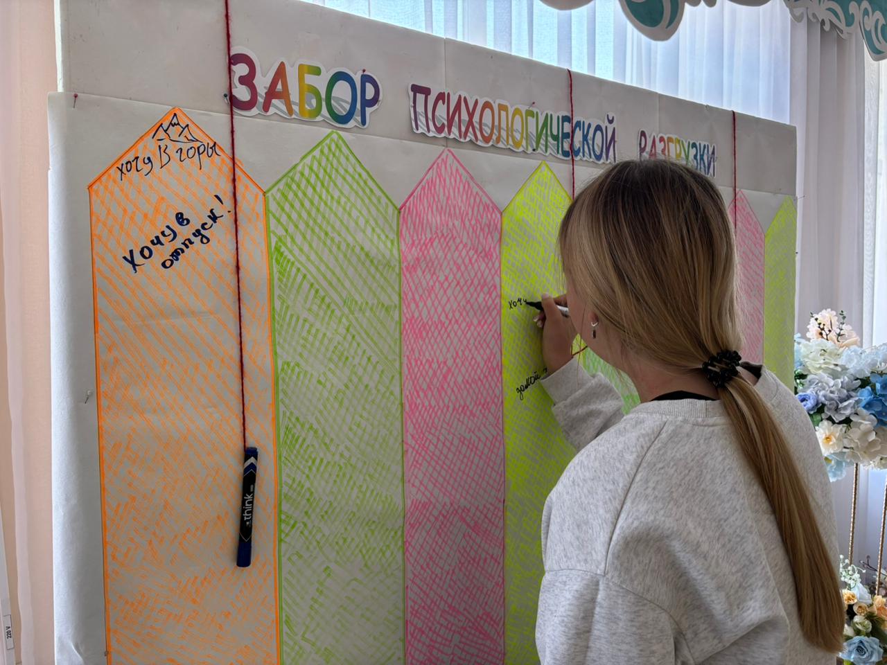 В рамках акции учащимся предложили написать свои мысли, чувства, впечатления, тревоги и радостные моменты на импровизированном «заборе разгрузки».