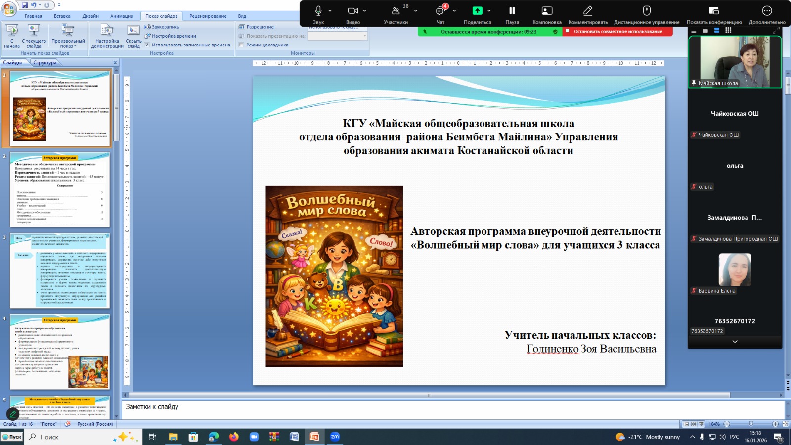 16 января 2026 года в онлайн-формате учитель начальных классов Голиненко З.В. представила трансляцию опыта работы по теме авторской программы «Волшебный мир слова» для учащихся 3-х классов, одобренной Учебно-методическим советом Костанайской области (протокол № 9 от 29.12.2025 г.).