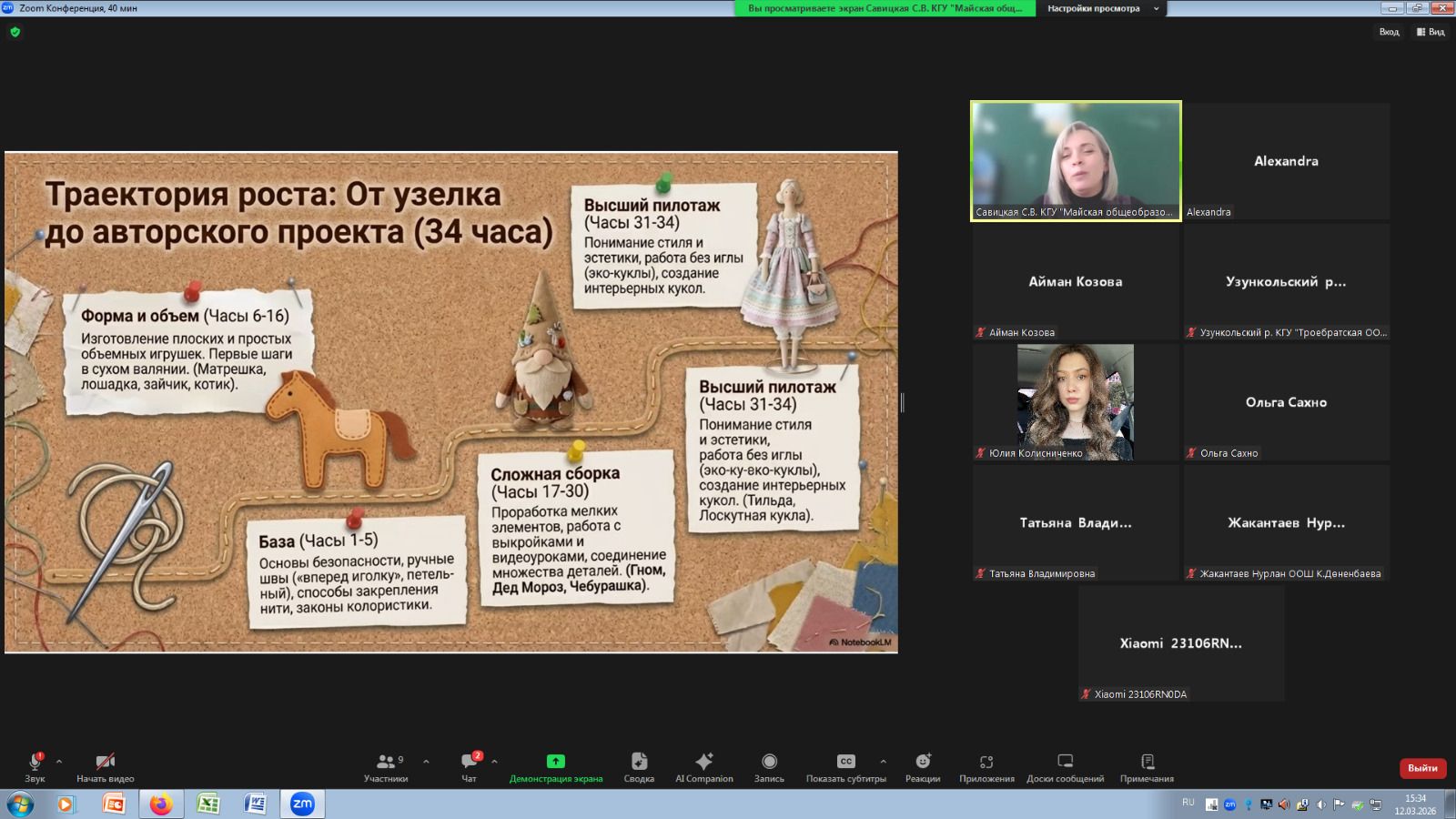 В рамках онлайн-трансляции педагогического опыта, 12 марта 2026 года, свою авторскую программу «Красота в мелочах: декоративные элементы интерьера» , одобренную Учебно-методическим советом Костанайской области (протокол №2 от 24.02.2026 г.), представила учитель художественного труда Савицкая С.В.