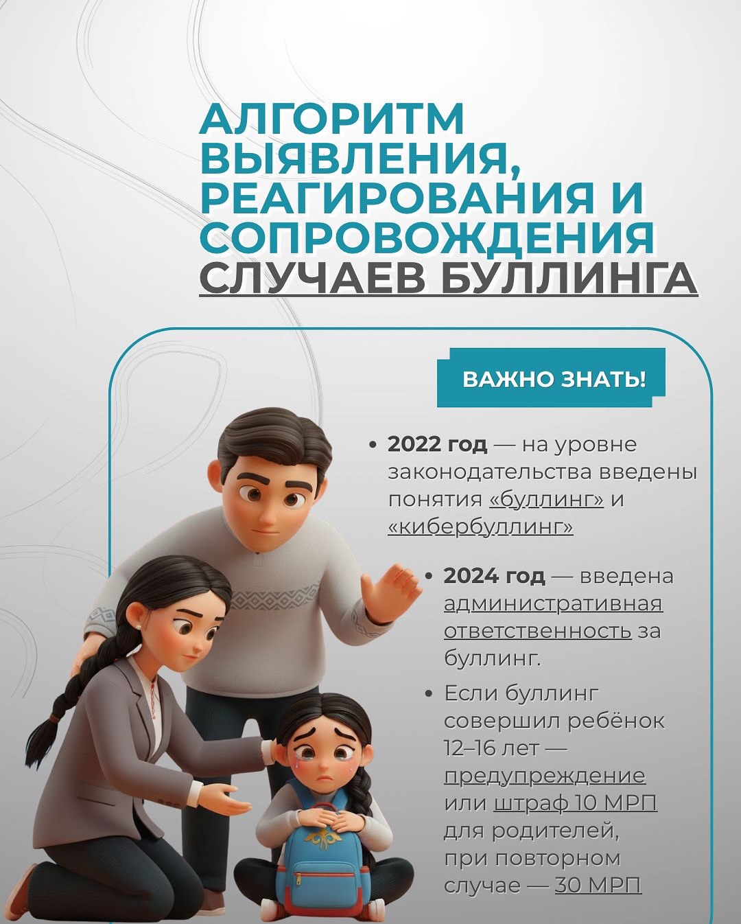 🛡️С 2022 года в Казахстане на законодательном уровне закреплены понятия «буллинг» и «кибербуллинг». С 2024 года за такие действия предусмотрена административная ответственность.