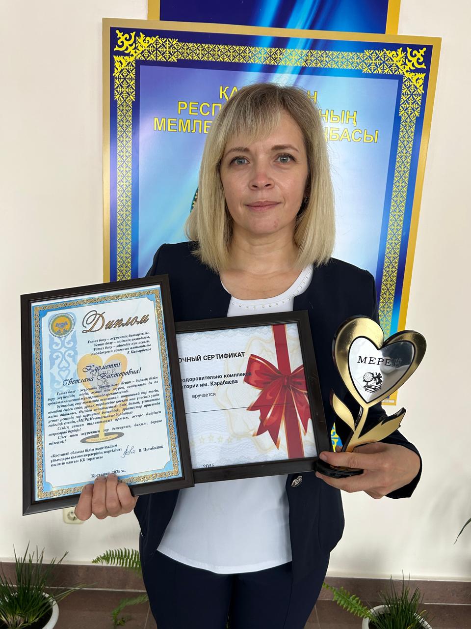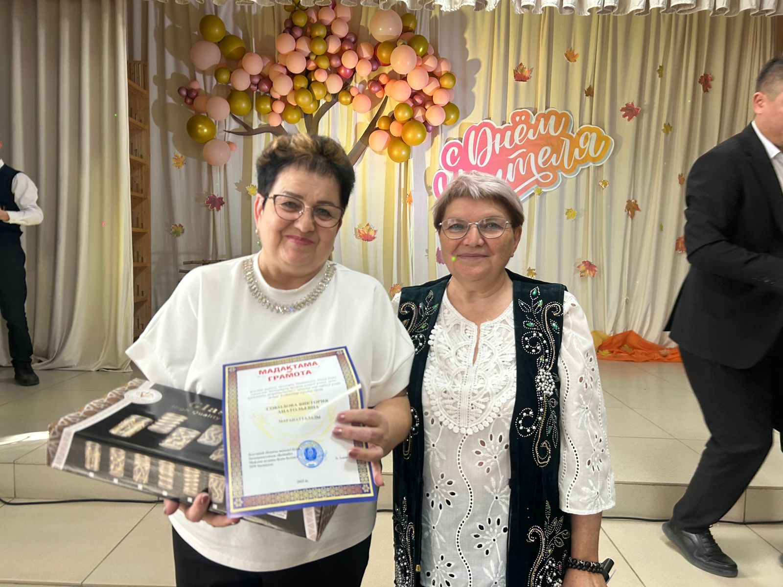 В честь празднования Дня учителя за добросовестный труд и вклад в развитие школьного образования дипломом и подарочным сертификатом оздоровительного комплекса санатория им. Карабаева от Локального профсоюза работников организаций образования и науки Костанайской области награждена