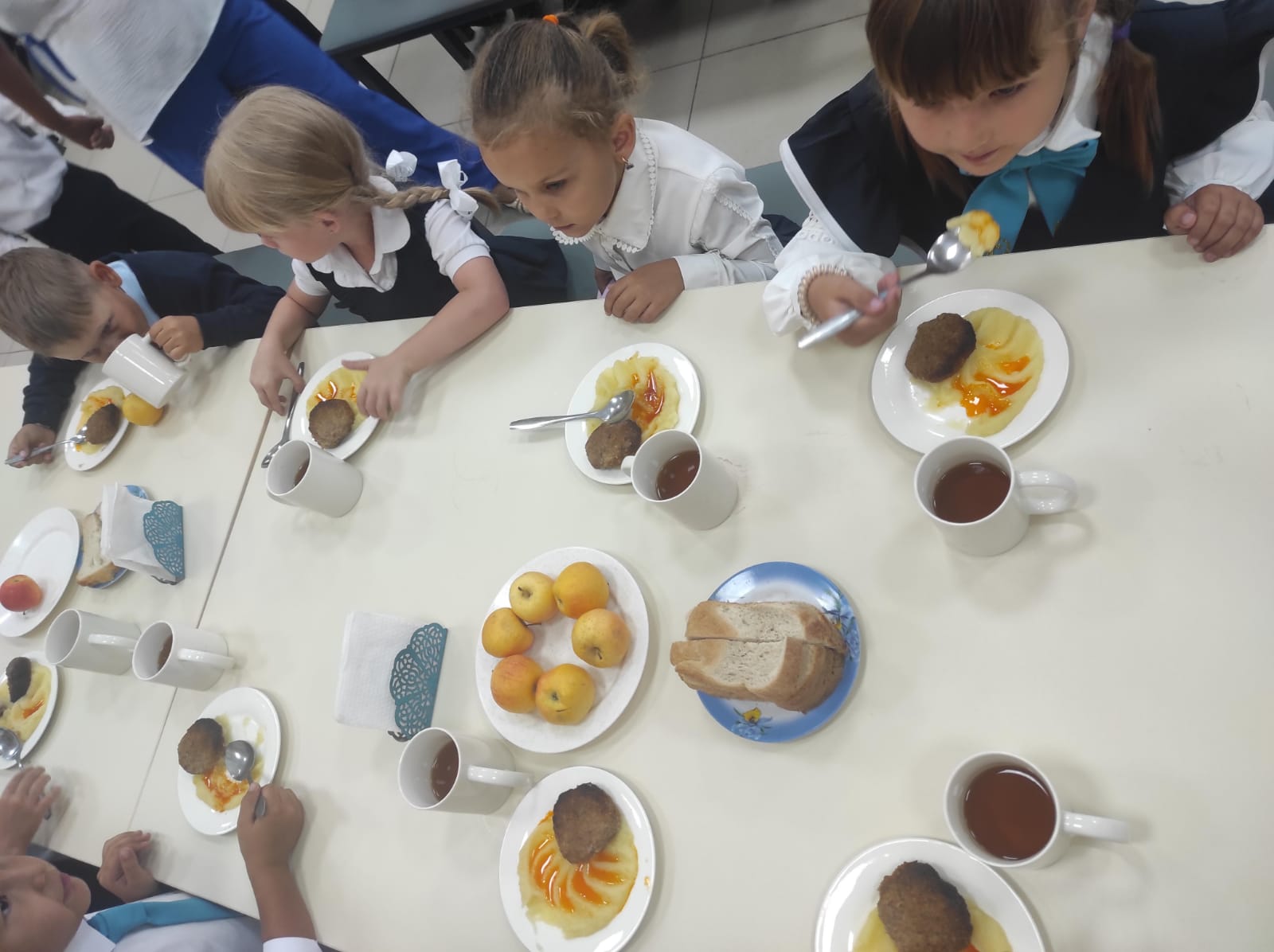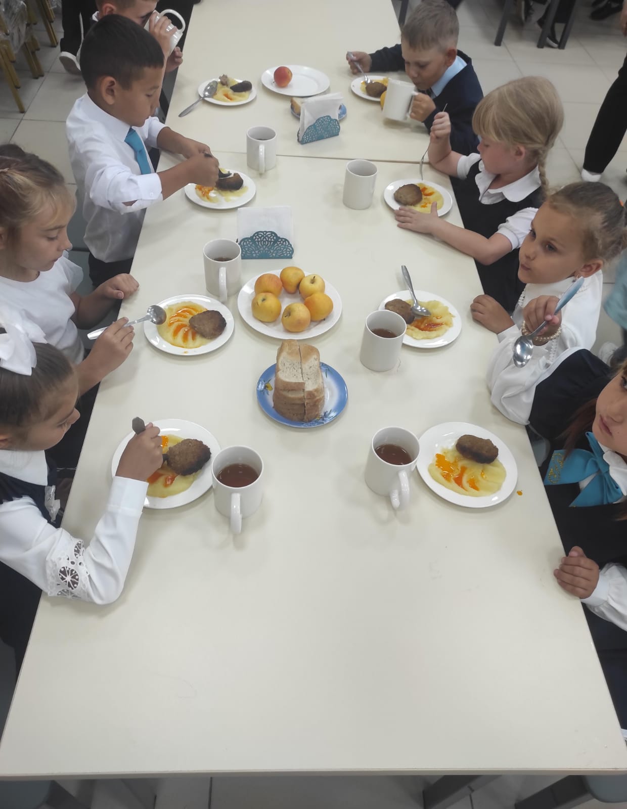 ✨ Меню сбалансированное и разнообразное: рыба – источник белка и йода, пюре – энергия на весь день, яблоко – витамины, а чай создаёт уютную завершённость обеда.